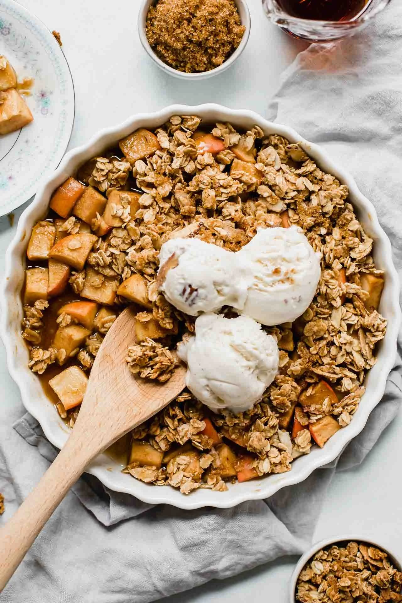 Looking for a delicious, warm-out-of-the-oven fall dessert that’s easy to make and guilt-free? This Healthy Apple Crisp recipe is sweet, indulgent, and lightened-up for a quick and easy treat! Made with maple syrup, oats, and fresh apples, this recipe is vegan, vegetarian, gluten-free, and dairy-free. This delicious apple dessert is the best for fall!